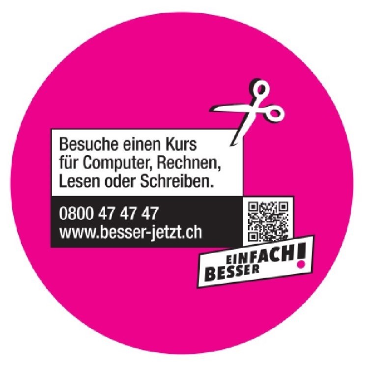 Bildungsgutscheine (im Wert von CHF 500) richten sich an Erwachsene mit guten Deutschkenntnissen (ab Niveau A2) und ermöglichen die Teilnahme an Kursen zu den Themen «Lesen und Schreiben», «Rechnen» oder «Computer». Das Kursangebot finden Sie unter www.einfach-besser.ch.
