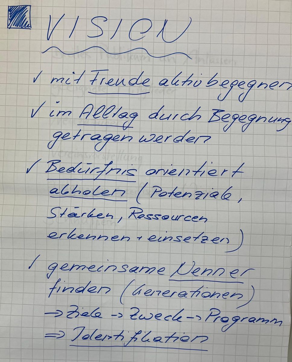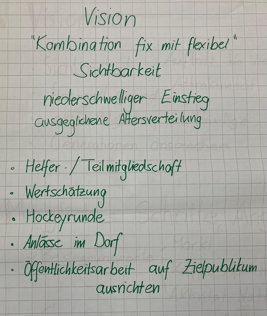 Der Vormittag stand unter dem Thema „Begegnungsorte“. Nach einem spannenden Input, das aufzeigte, dass Begegnungsorte sowohl real als auch virtuell gestaltet werden können, arbeiteten die Teilnehmenden in Gruppen an Visionen für ihre Vereine. Sie diskutierten, wie Vereine selbst zu Orten der Begegnung werden und neue Handlungsspielräume schaffen können.