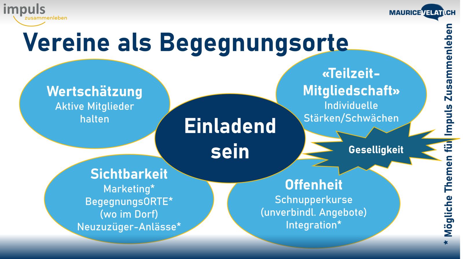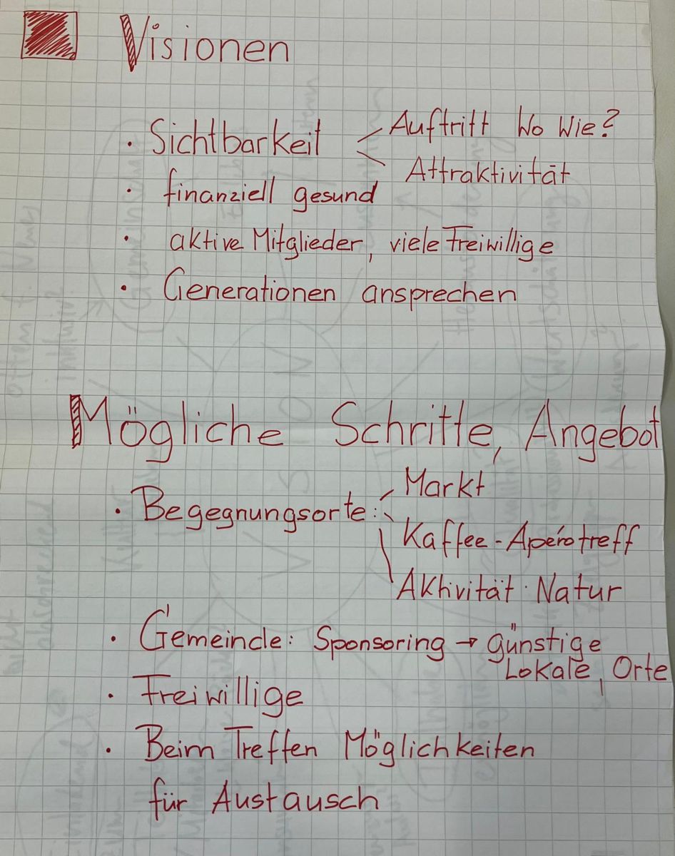 - Das Thema Werbung für Vereine und deren Angebote bleibt aktuell. Meinrad Dörig würde dazu gerne eine Arbeitsgruppe bilden, um daran konkreter zu arbeiten: Mail: freiwilligenarbeit@impuls-zusammenleben.ch.